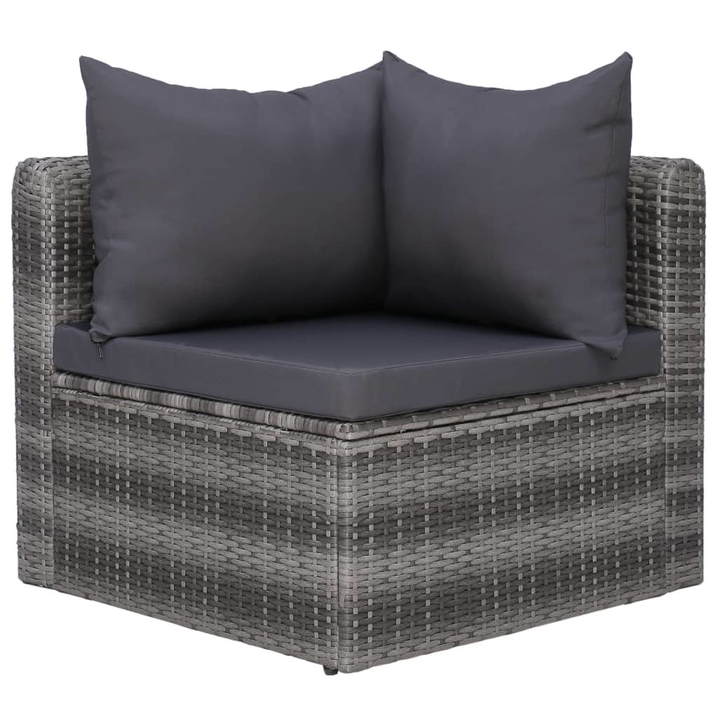Note: We recommend covering the furniture set during rain, snow and frost for its best service to last.Color: GrayMaterial: Poly rattan + powder-coated steel frame + glassCushion pillow cover material: 100% polyesterCorner sofa: Dimensions: 28.3" x 28.3" x 24.8" (W x D x H)Seat width: 24.4"Seat depth: 24.4"Seat height from the ground without cushion: 13"Center sofa: Dimensions: 26.8" x 28.3" x 24.8" (W x D x H)Seat width: 26.8"Seat depth: 24.4"Seat height from the ground without cushion: 13"Single sofa: Dimensions: 31.5" x 28.3" x 24.8" (W x D x H)Seat width: 23.6"Seat depth: 24.4"Seat height from the ground without cushion: 13"Coffee table dimensions: 24.4" x 24.4" x 13" (L x W x H)Cushion thickness: 2.4"Pillow thickness: 5.9"Delivery includes: 3 x Corner sofa2 x Center sofa1 x Single sofa1 x Coffee table6 x Seat cushion9 x Back PillowWARNING Cushion and pad are only for outdoor use. Do not take them inside of dwelling