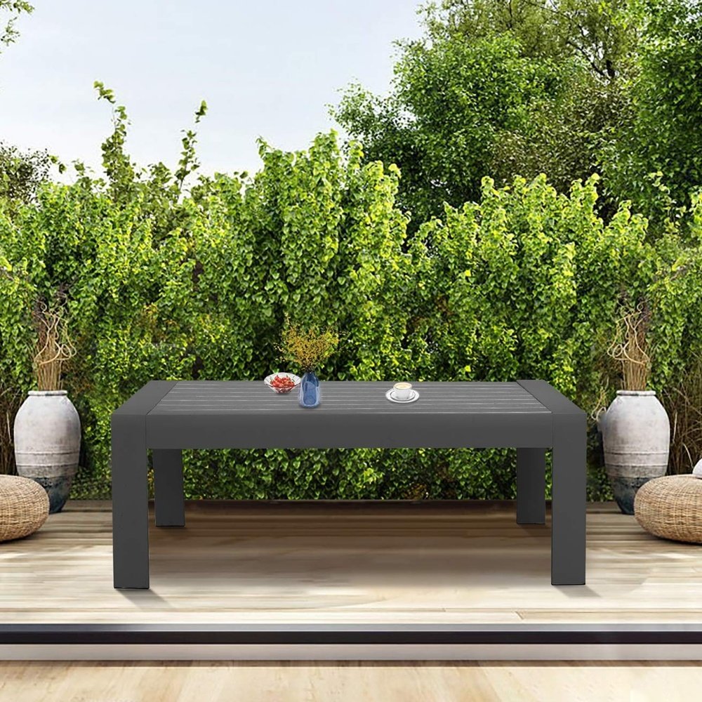 Description:Product Material:Our modern patio furniture is crafted with upgraded all-aluminum, which is different from iron sofas on the market. Aluminum was once known as the aristocracy of metals because of its unique properties. The surface of aluminum will naturally form an oxide layer and can protect itself from rusting, fading, and corroding in all kinds of weather.Product Design:Different from other options of rough-cut natural wood or easily fragile glass top, this durable aluminum outdoor patio furniture will ensure safe capabilities. A textured wood top with a slat design sits atop the substantial base that let rainwater trickle right through, the metal coffee table stands up to sun and rain naturally.